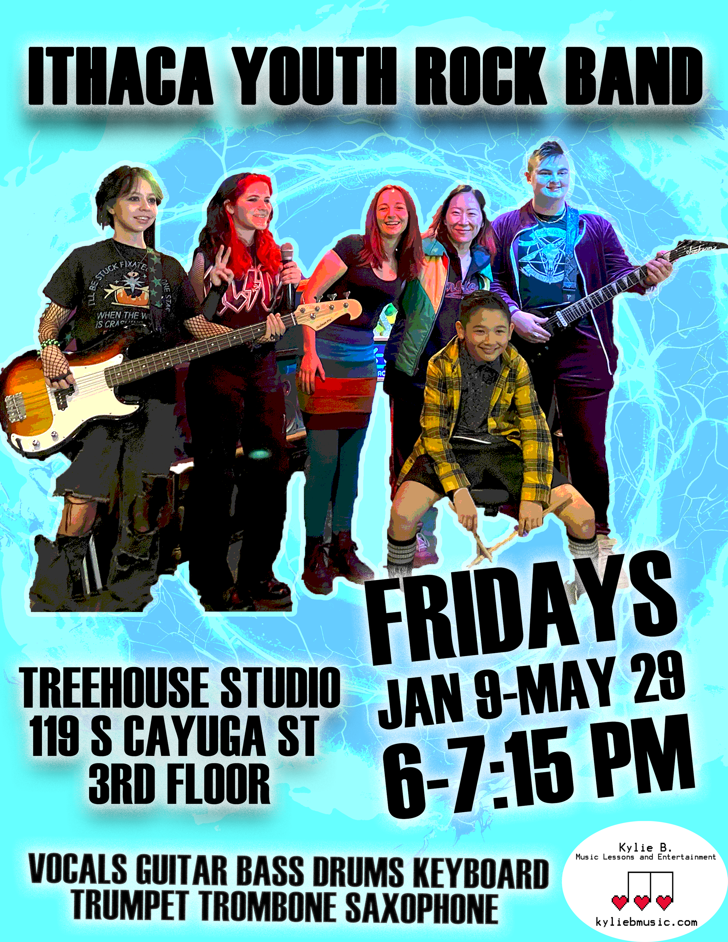 The rock band class is located at Treehouse studio, 119 S Cayuga St. on the 3rd floor in downtown Ithaca. Please let Kylie know in advance if you’d like to observe by filling out the form below.